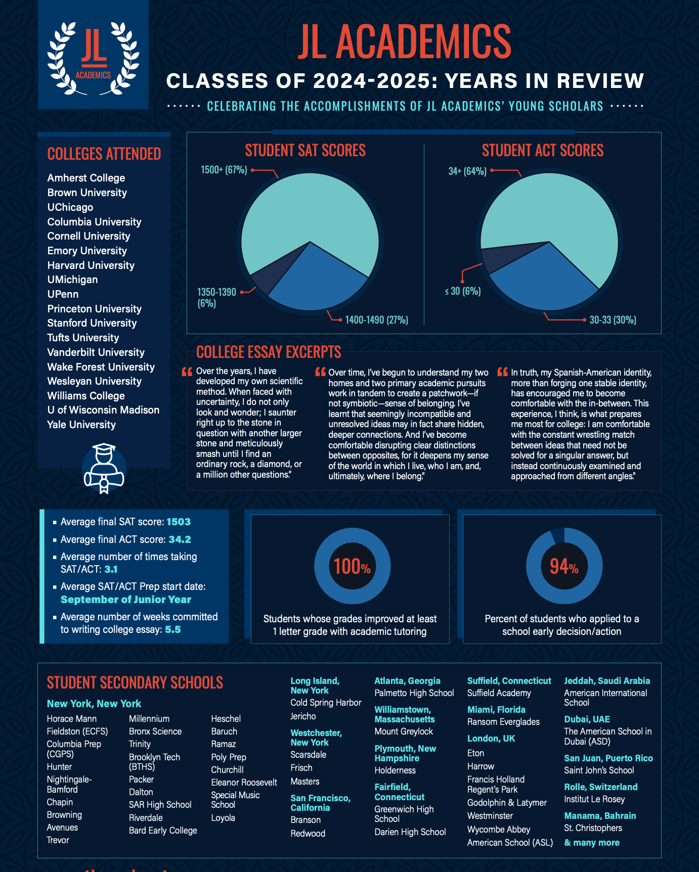 With 10,000+ instruction hours provided for 250+ students in 50+ schools across 15+ countries, JL ACADEMICS is celebrated for connecting, encouraging, and inspiring students of all different backgrounds, many of whom go on to pursue scholarship at Ivy+ US colleges and universities.